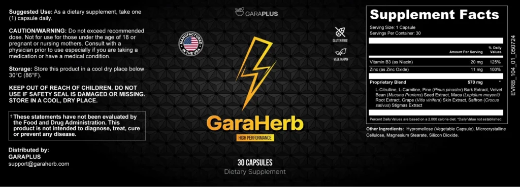 GaraHerb features a blend of natural plant extracts, amino acids, and essential nutrients formulated to support circulation, male vitality, and overall performance. Its ingredients are selected to help nourish the body, encourage healthy blood flow, and promote stamina and confidence as part of a balanced lifestyle.